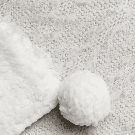 White Baby Knitted Wrap with Fleece Backing and Fluffy Pom Poms