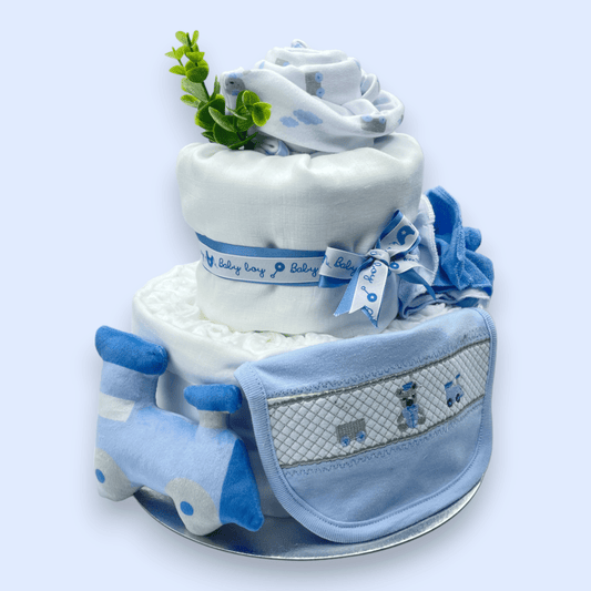 Charming 2-Tier Blue “Train” Nappy Cake – Perfect Gift for New Parents