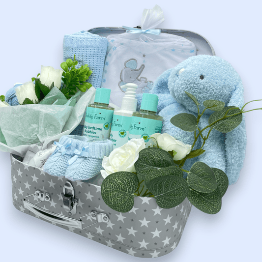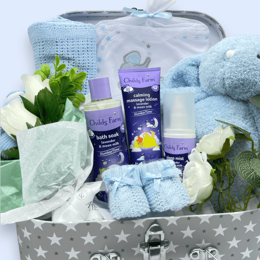 Childs Farm Slumber Time Large Suitcase Hamper with Bouquet (Blue)