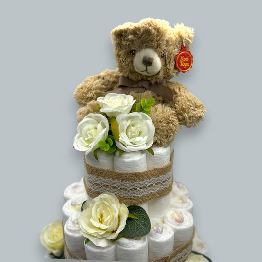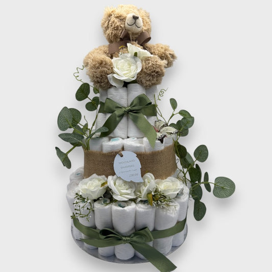 Woodland Whispers 3-Tier Nappy Cake – Rustic Baby Gift