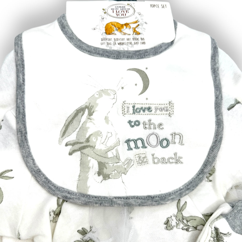 1. White Bib with Grey Edging and 'Guess How Much I Love You' Bunnies, featuring the caption "I love you to the moon and back"