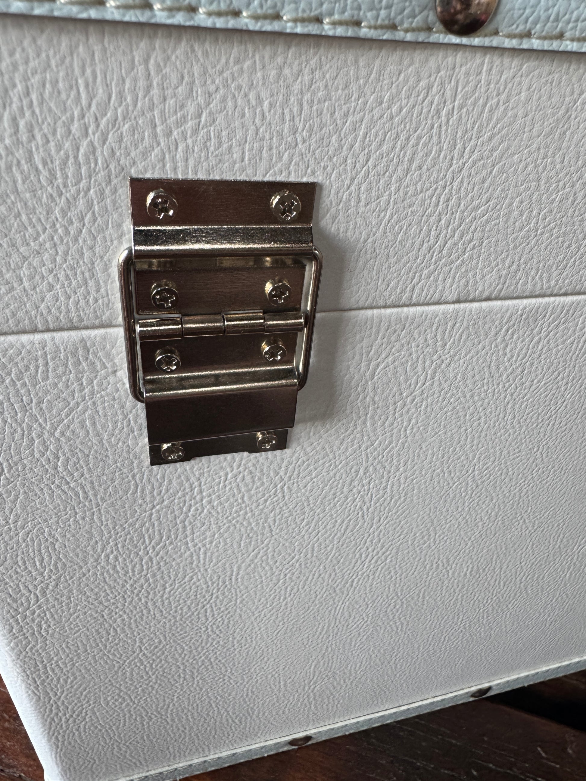 - Studded soft blue leatherette trim with chrome-finish studs, handles, and swing clasps